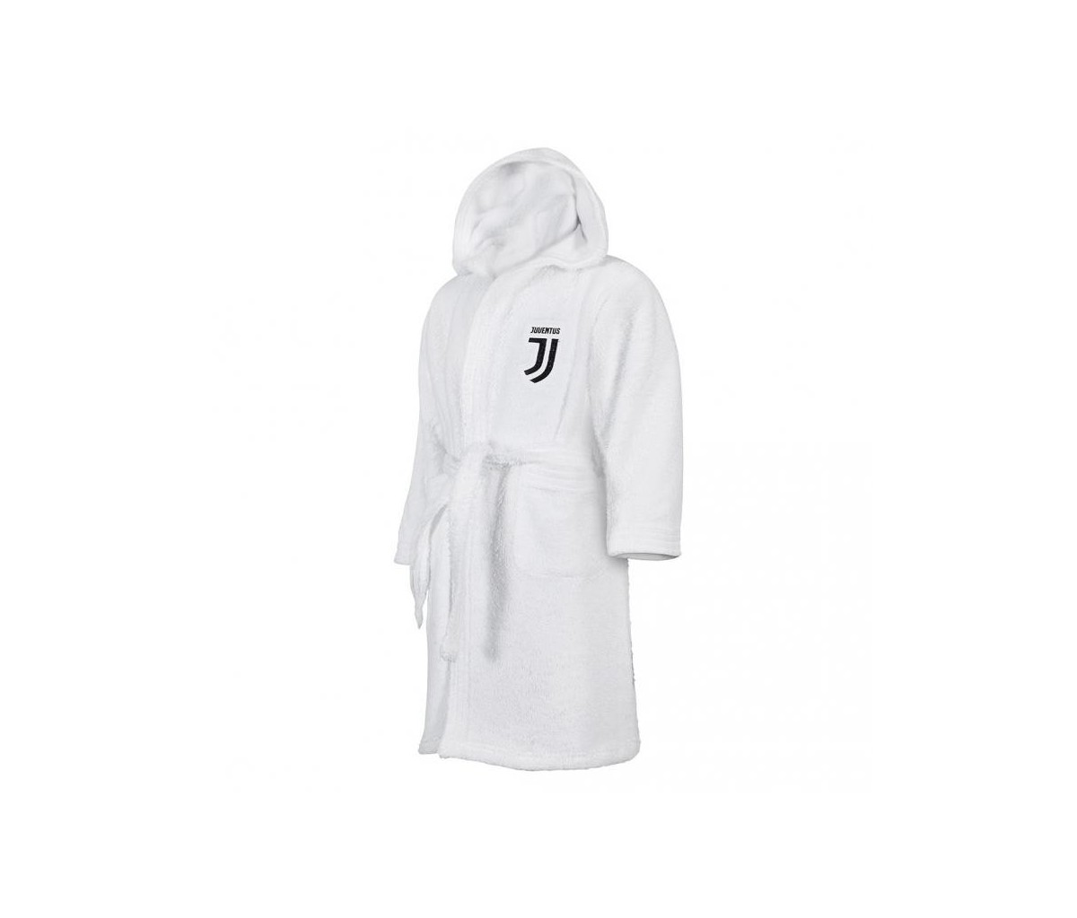L'accappatoio Juventus originale FIGC è disponibile nel color bianco nelle taglie 4/6, 8/10 e 12/14 anni, rifinito con un bordino nero ed ha applicato sul petto lo scudetto della Juventus.