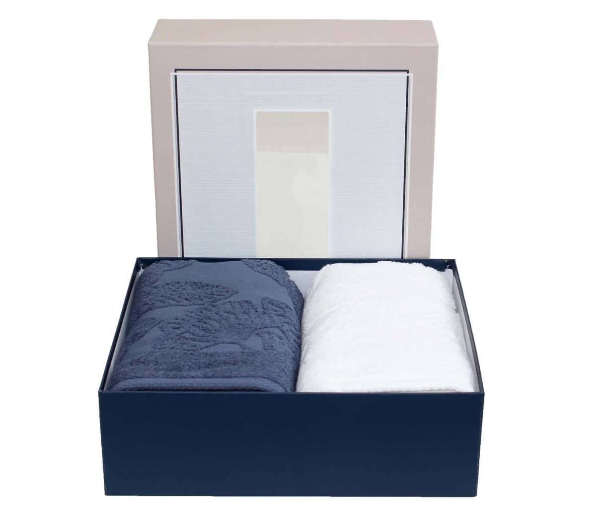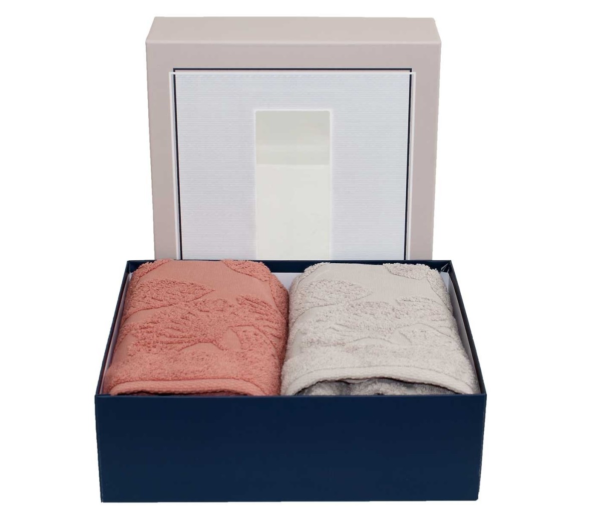 Caratteristiche del set di asciugamani in spugna Martina sono il bordo jacquard decorato con motivo floreale presente sia nell’asciugamano che nell’ospite e la confezione in una bella scatola che li rende perfetti per un regalo raffinato e utile.
