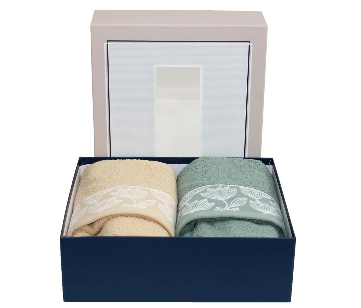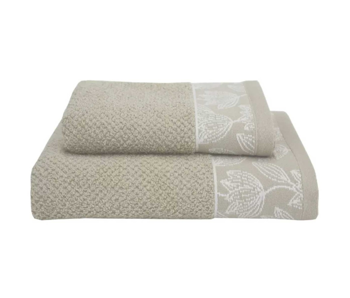 Caratteristiche del set di asciugamani in spugna Rachele sono il bordo jacquard decorato con motivo floreale presente sia nell’asciugamano che nell’ospite e la confezione in una bella scatola che li rende perfetti per un regalo raffinato e utile.