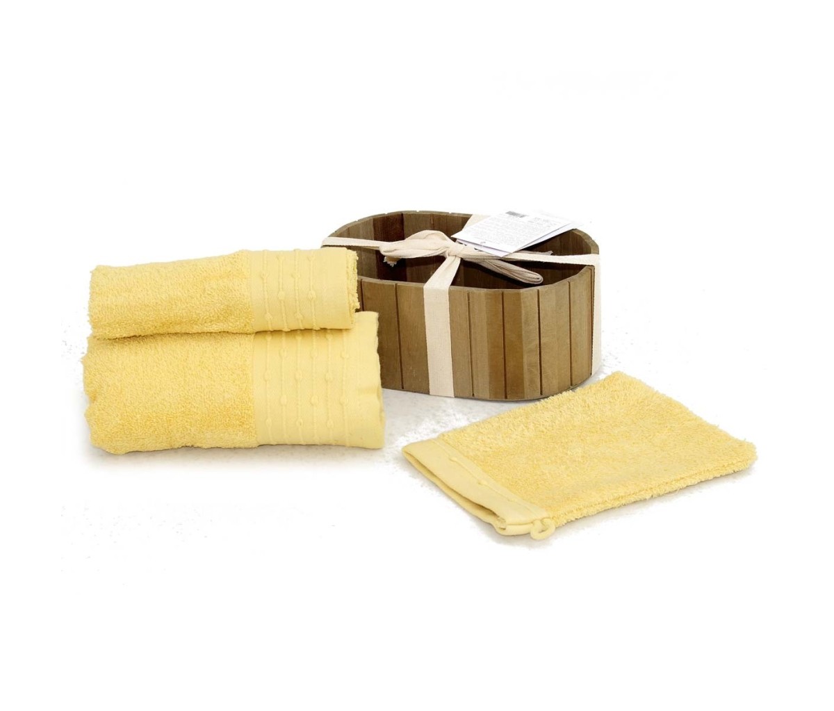 Set composto da: 1 asciugamani 50x100 cm + 1 ospiti 30x50 cm + 1 guanto + scatola portaoggetti in legno