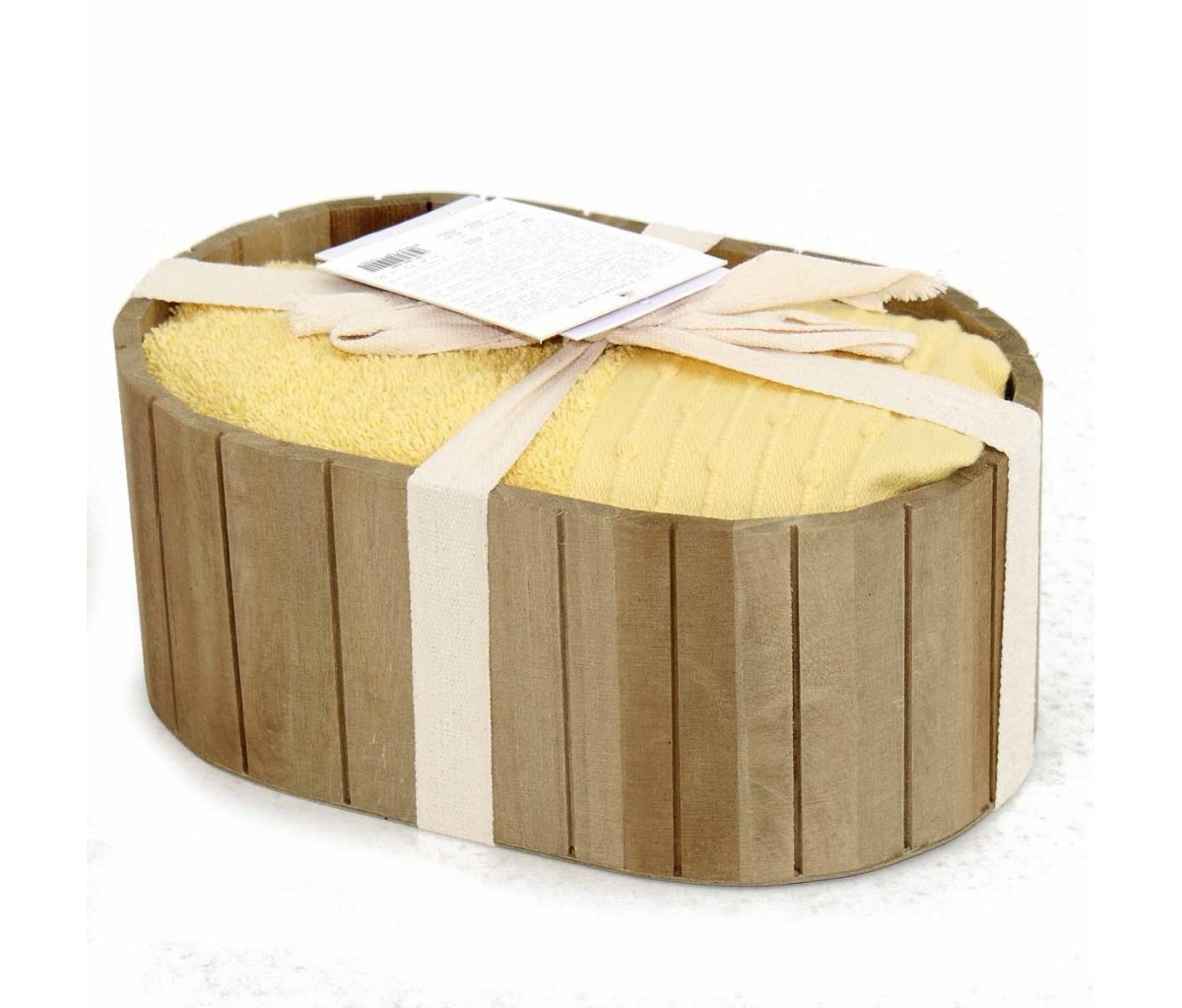 Il set bagno asciugamano e ospite è confezionato in una bella scatola di legno che lo rende perfetto per un regalo raffinato e utile.