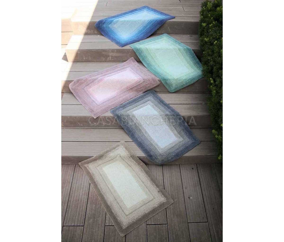 Il tappeto di cotone Degradè è dotato sul retro di un pratico antiscivolo con gocce di silicone che lo rendono stabile ed aderente al pavimento.