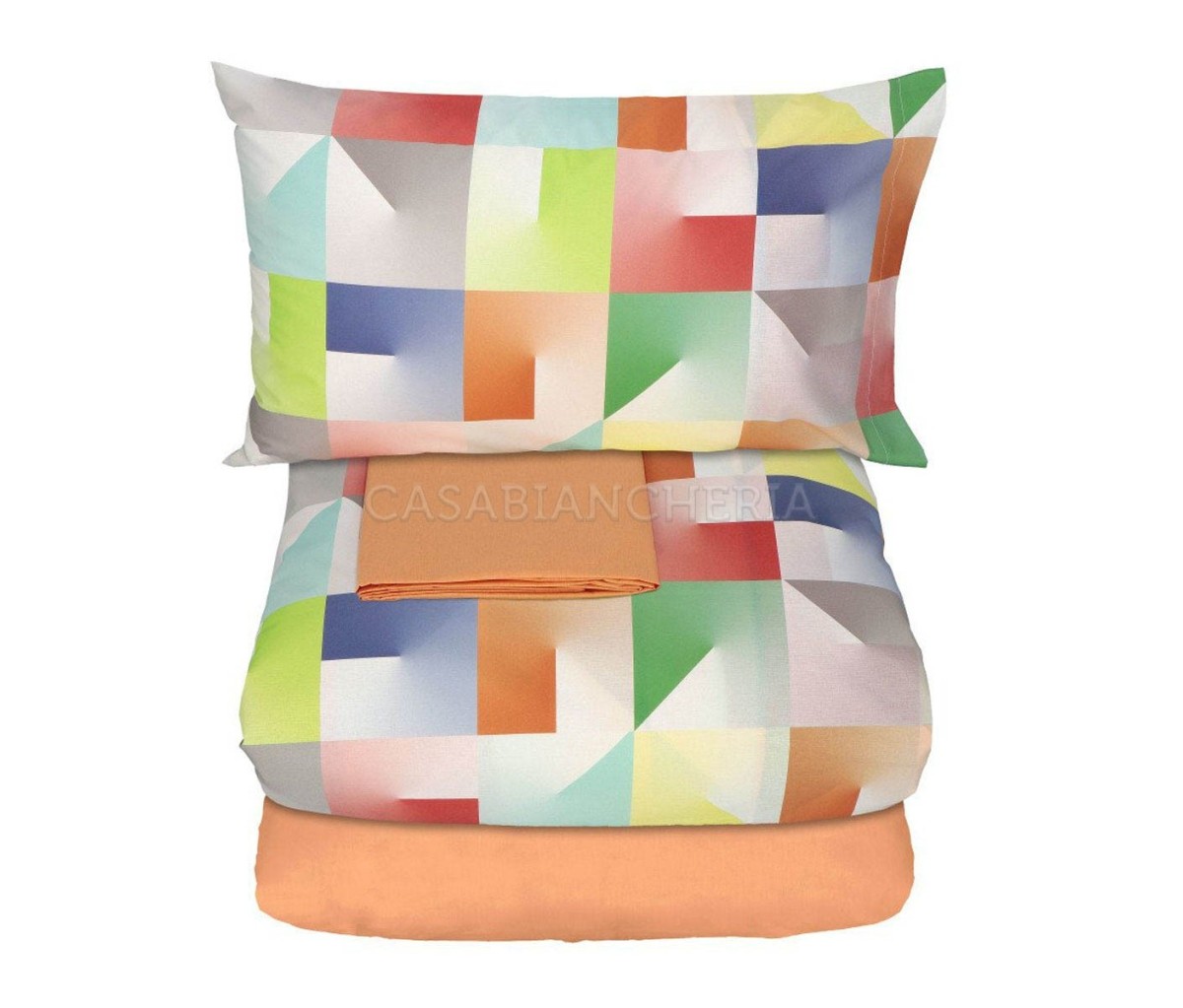 Il sacco copripiumino è dotato di due aperture ai lati della “testa” per facilitare e rendere più veloce l’inserimento del piumino; copripiumino e federe sono double face stampati su ambo i lati ed il lenzuolo da sotto tinta unita.