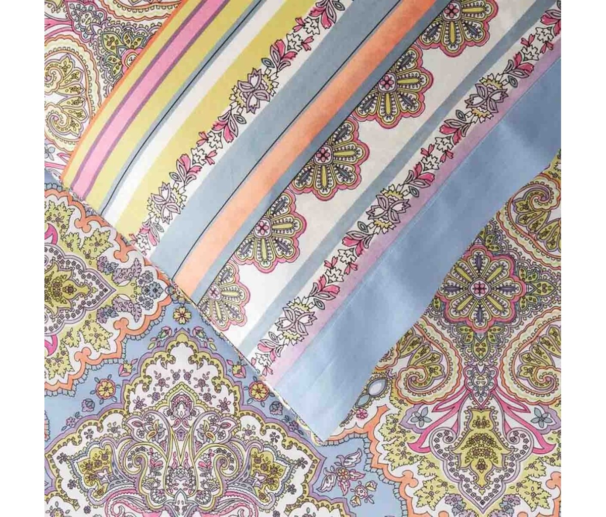Il set lenzuola copriletto matrimoniale Marechiaro di Bassetti è composto da un lenzuolo da sopra e due federe stampati ed il lenzuolo da sotto tinta unita con angoli elasticizzati di 30 cm per vestire comodamente anche i moderni materassi. Prodotto, stampato e confezionato in Italia con la cura e la competenza che fanno di Bassetti uno dei migliori produttori di biancheria per la casa, il lenzuolo Marechiaro è coordinabile con copritutto, copripiumini, trapunte, plaid e cuscini arredo della stessa linea Granfoulard.