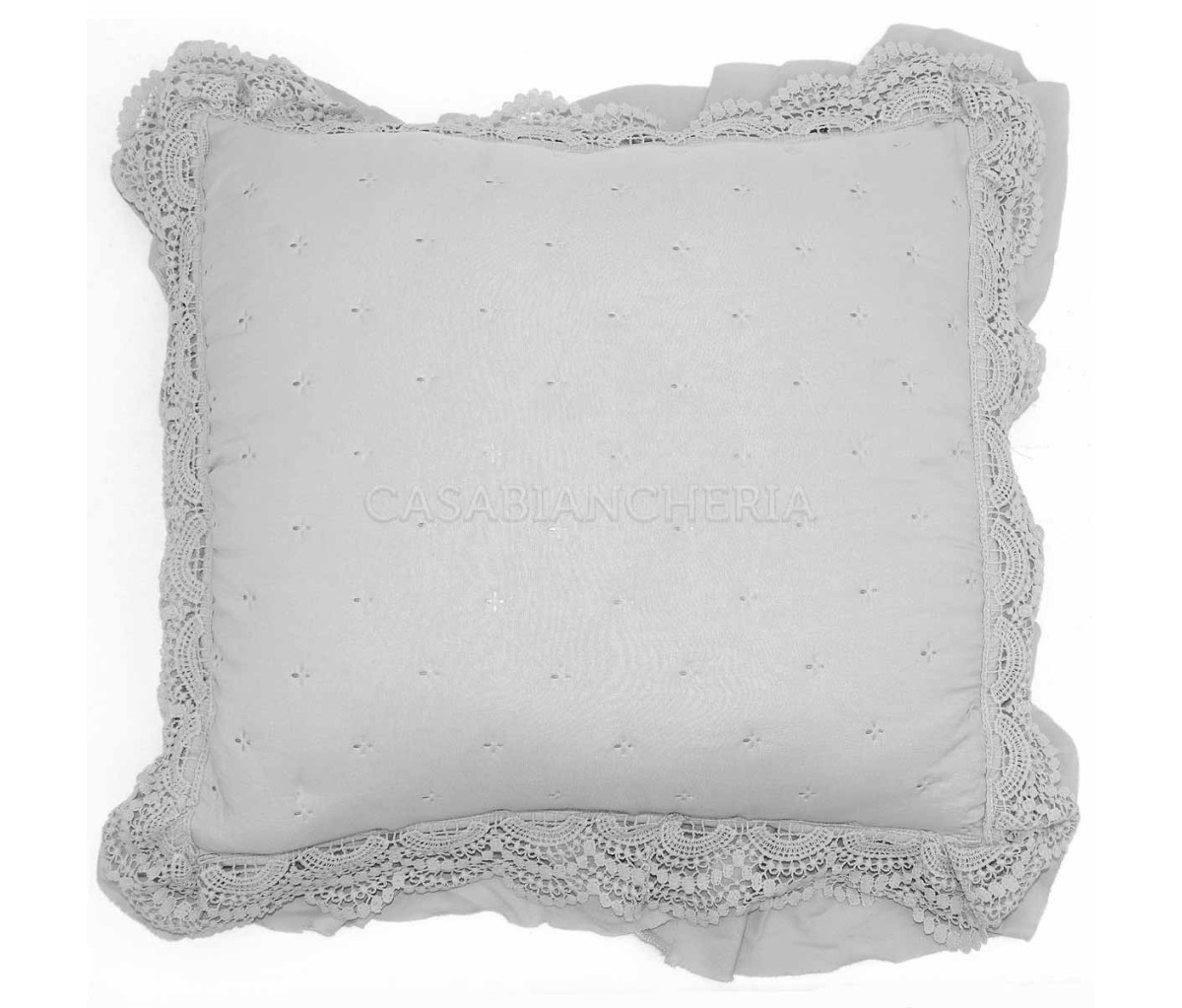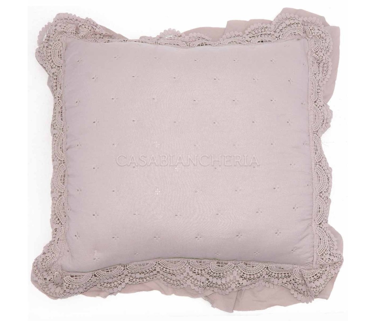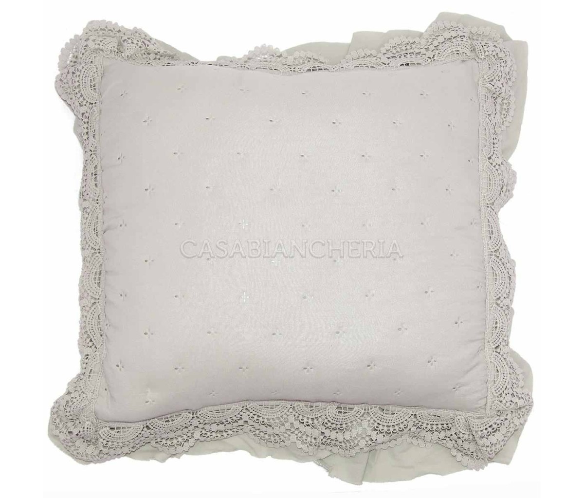 Il cuscino decorativo Saint Remy è prodotto con tessuto di microfibra arricchito con l’applicazione di pizzo macramè e gala sui quattro lati.