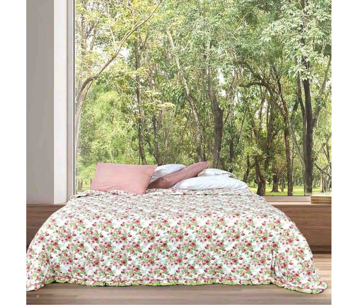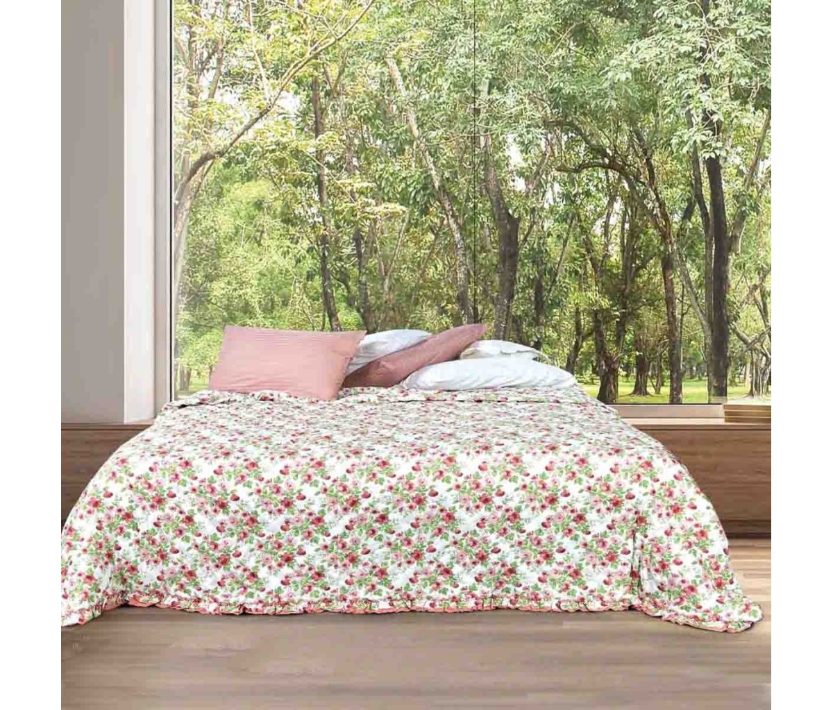 Confezionato con morbido tessuto di microfibra, il copriletto trapuntato Caen è decorato con motivo floreale e rifinito con l’applicazione di volant lungo tutto il bordo.
