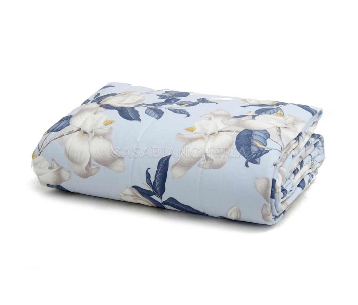 Il copriletto trapuntato Isabel è confezionato con tessuto saia jacquard di puro cotone stampato ed imbottito con fibra anallergica.