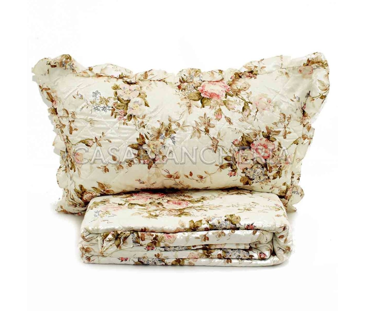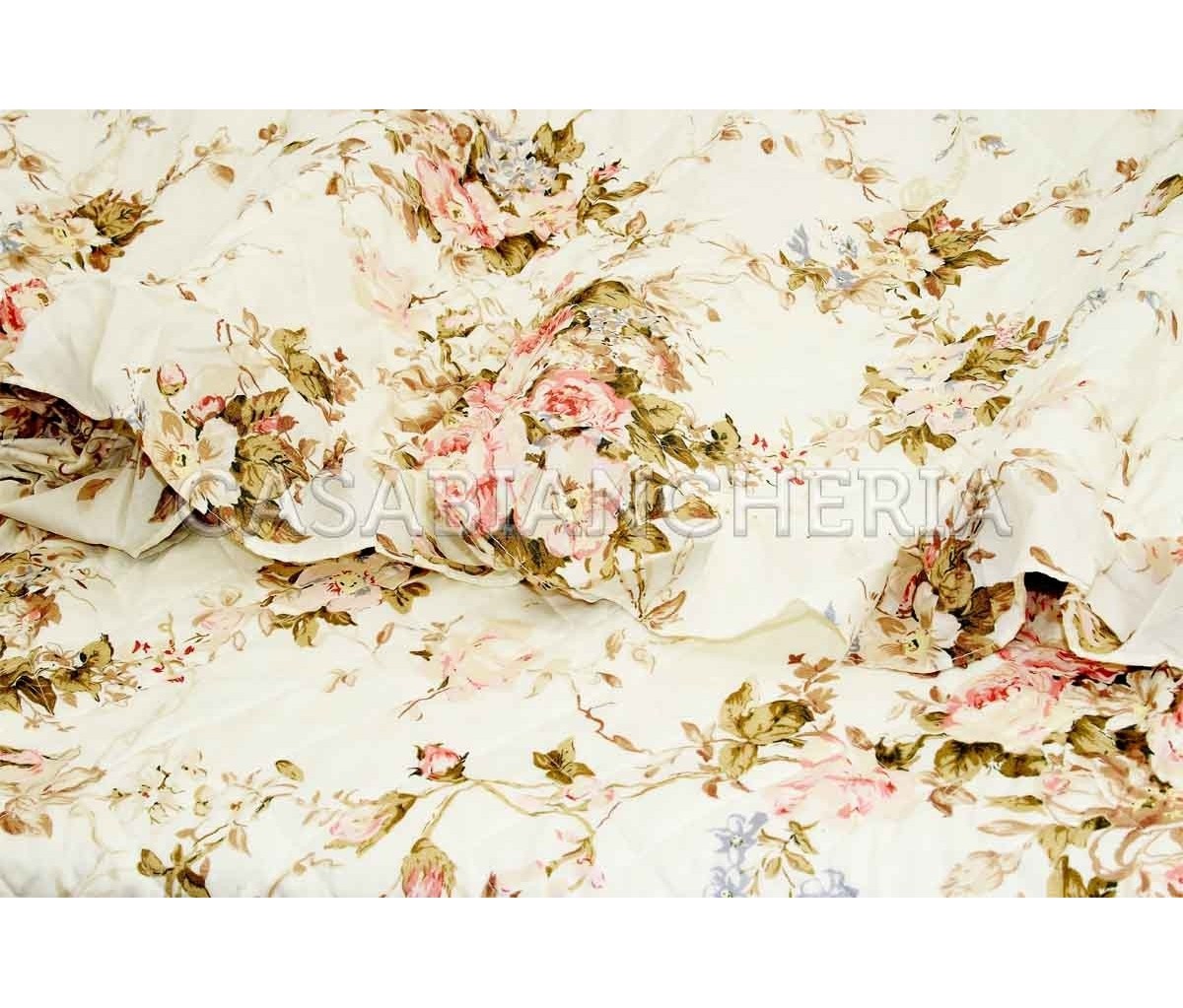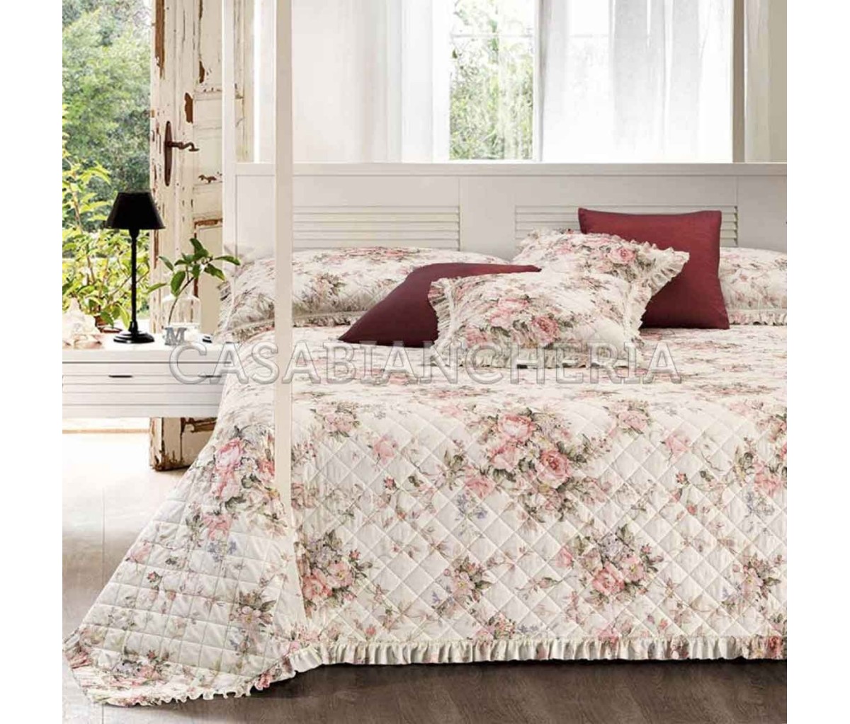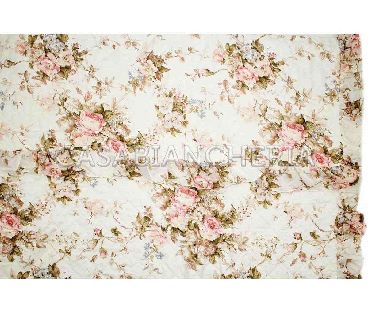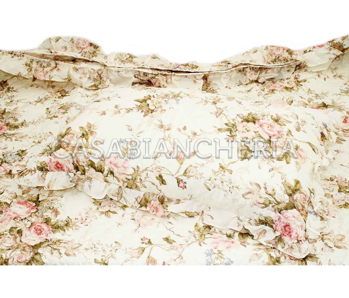 La confezione del prodotto, come da tradizione di GF Ferrari è molto curata: l’applicazione di volant, la selezione dei tessuti più appropriati e l’imbottitura di soffice falda in fibra naturale sono un insieme di elementi combinati per dare il massimo confort. Il motivo shabby chic del trapuntino estivo California giocato su delicate tonalità rosa e beige dona un mood romantico alla tua camera da letto; il tutto senza tralasciare la primaria funzione del copriletto trapuntato che è quella di mantenere il calore corporeo durante il sonno nelle fresche sere primaverili con soffice leggerezza.