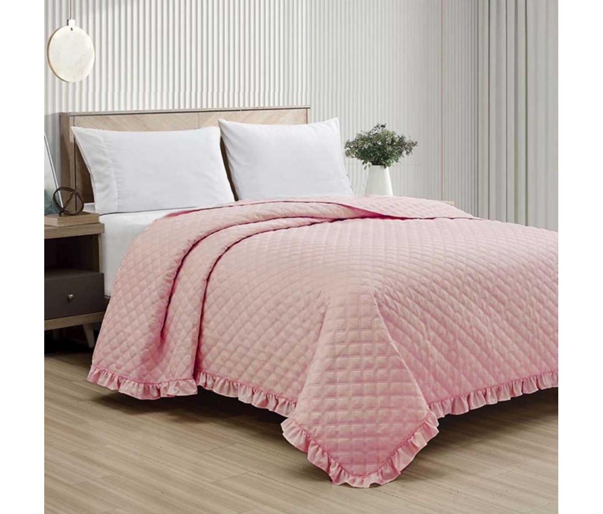 Confezionato con morbido tessuto di microfibra, il copriletto trapuntato Pazzie d’Amore è rifinito con l’applicazione di volant lungo tre lati.