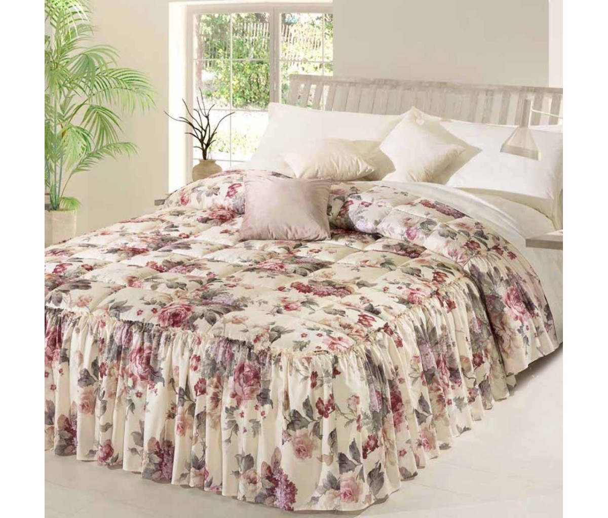 Il trapuntino matrimoniale Tamara Vera di GF Ferrari è prodotto con morbido tessuto di microfibra stampata, imbottita con soffice fibra anallergica e rifinita con applicazione di volant su tre lati con spacchi laterali per vestire comodamente il letto.