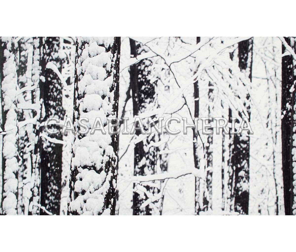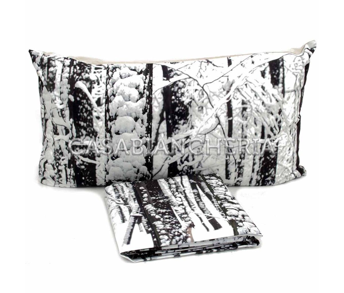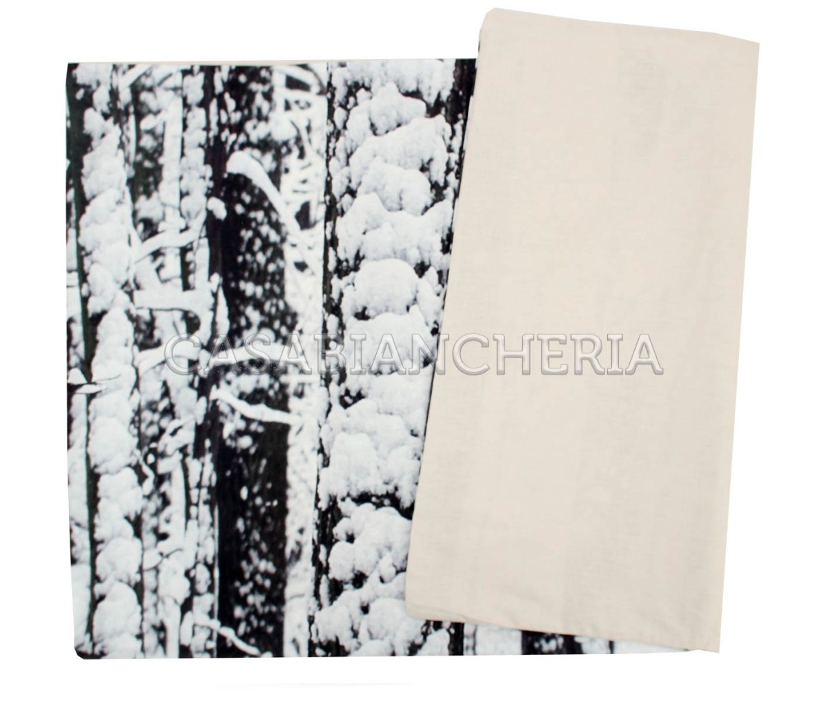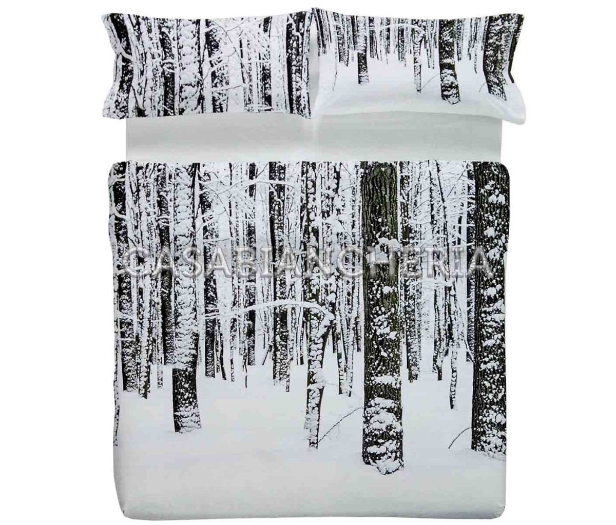 La parure copripiumino matrimoniale Wood di Daunex è caratterizzata da una stampa digitale sulle federe e sul sacco copripiumino con disegno di bosco innevato di betulle.