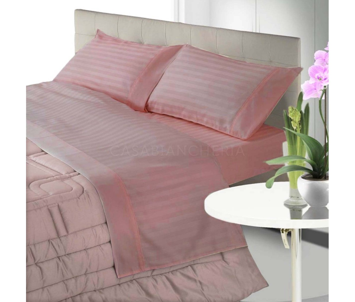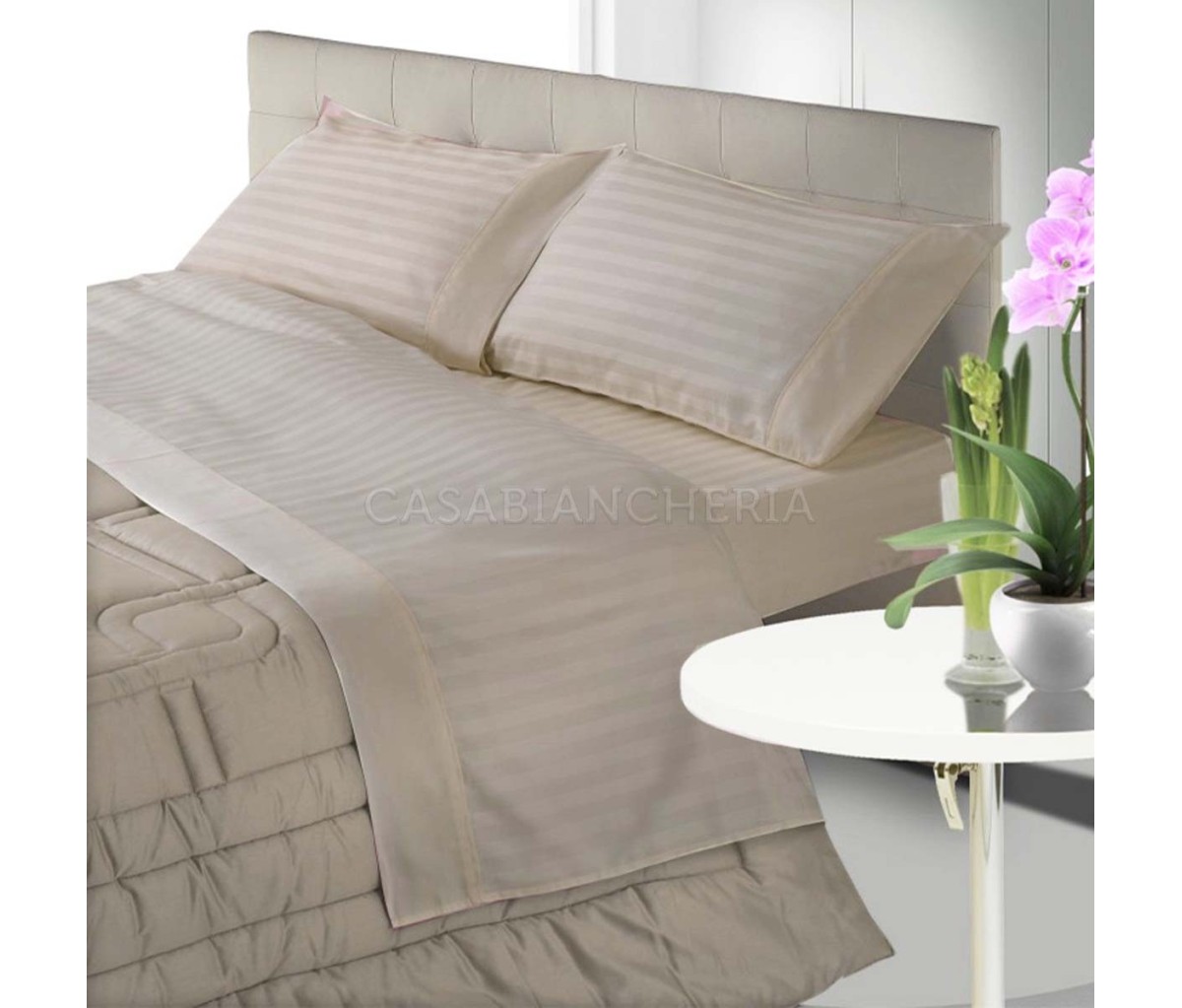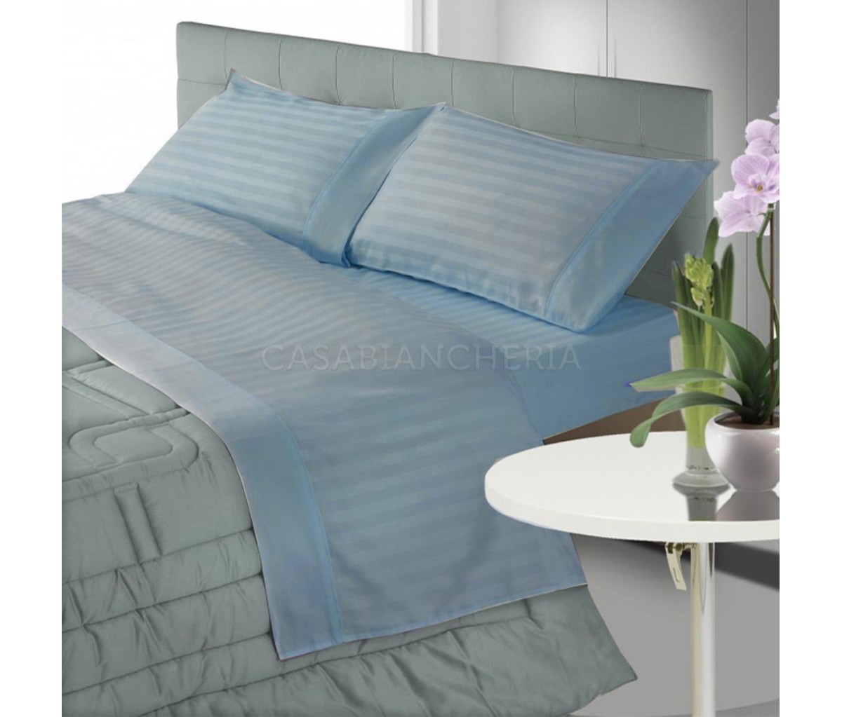 Il set copripiumino Tinta Unita è confezionato con tessuto in raso di puro cotone pettinato tessuto a riga con effetto lucido-opaco. Il copripiumino Tinta Unita ha una morbidezza simile alla seta ed è composto dal sacco copripiumino e due federe con bordo applicato; il sacco copripiumino è dotato di patella di rincalzo che posta sotto il materasso mantiene fermo e stabile il copripiumino. La parure copripiumino di raso Tinta Unita è disponibile in diverse varianti di colore nella misura per letto matrimoniale.