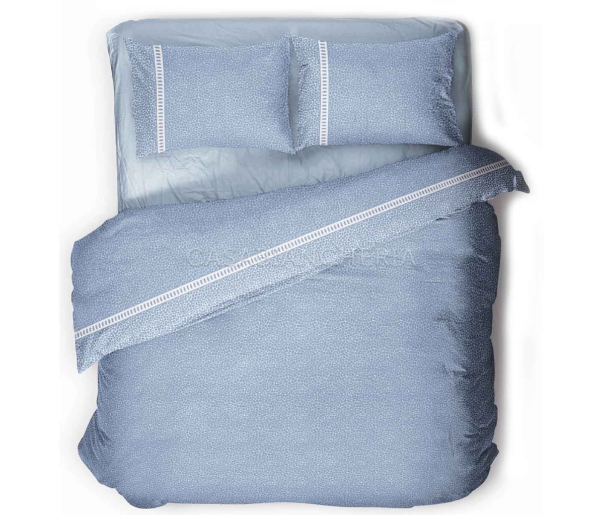 Il sacco copripiumino Crono è dotato sul fondo di patella di rincalzo da inserire sotto al materasso per fermare il sacco sul letto; copripiumino e federe sono double face con motivo a occhio di pernice stampato da un lato e tinta unita sul rovescio.