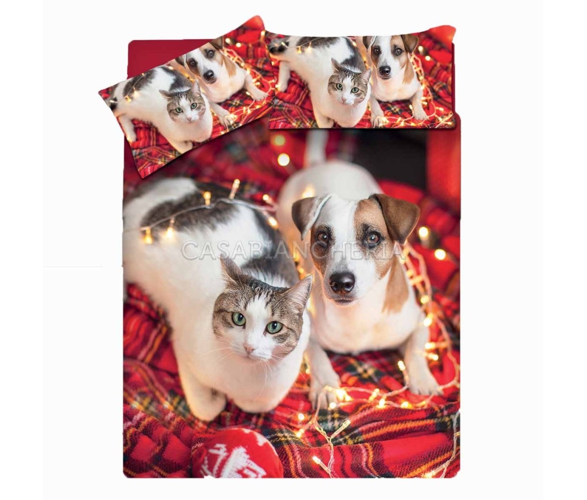 La parure copripiumino Puppies è caratterizzata da una stampa fotografica a campo pieno sulle federe e sul sacco copripiumino nella parte superiore e tinta unita sul rovescio. La parure copripiumino Puppies, composta dal sacco copripiumone e dalla federa, è disponibile nella misura per letto singolo, matrimoniale e 1 piazza e mezza ed ha sul fondo una patella di 50 cm per rincalzare e fermare il copripiumino sotto al materasso