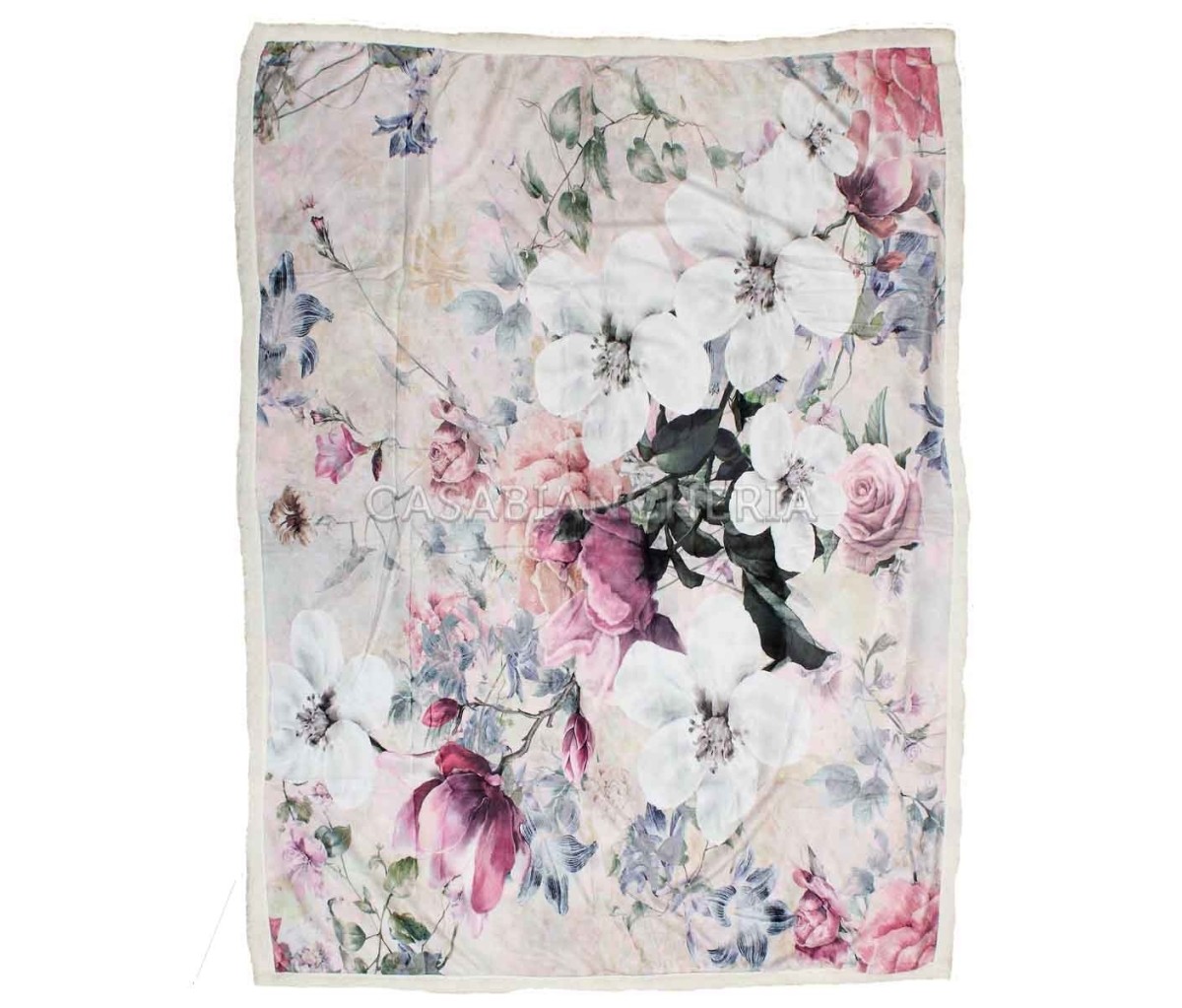 Il plaid di pile agnellato Art è prodotto con un doppio strato di pile di microfibra con la parte superiore stampata in digitale con motivo floreale e la parte inferiore in soffice agnellino tinta unita color panna.