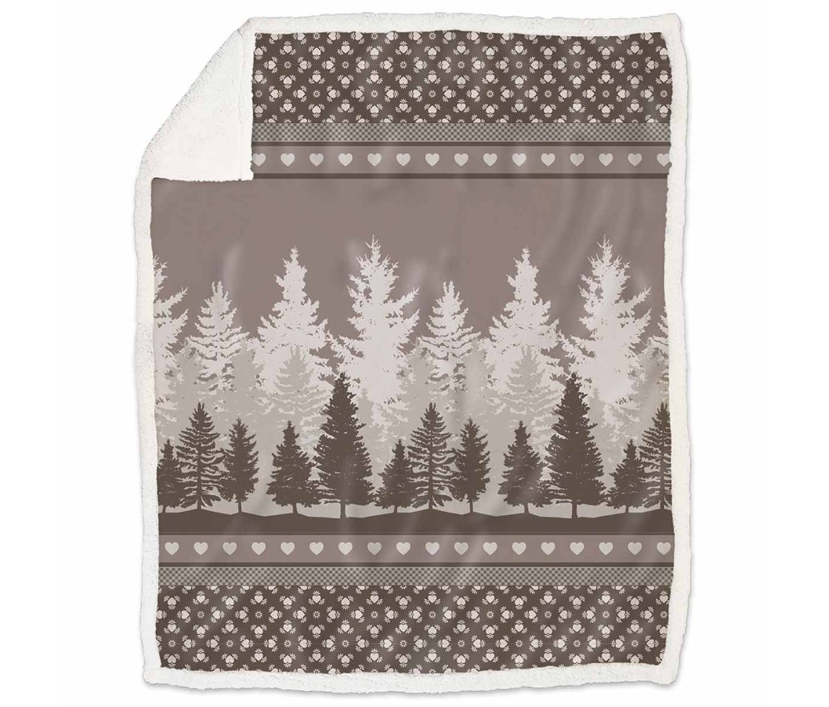 Il soffice plaid agnellato Foresta è realizzato in morbido pile flannel stampato con motivo alpino doppiato con pelouche effetto "agnellino" color panna che lo rende caldo e confortevole.