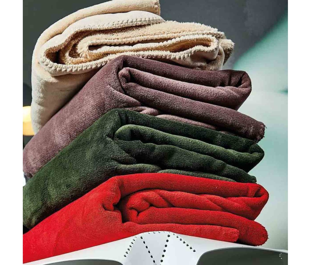 Il plaid di pile agnellato New York è prodotto con un doppio strato di pile di microfibra tinta unita con la parte superiore in pile velvet e la parte sotto in soffice agnellino in tinta con il sopra.