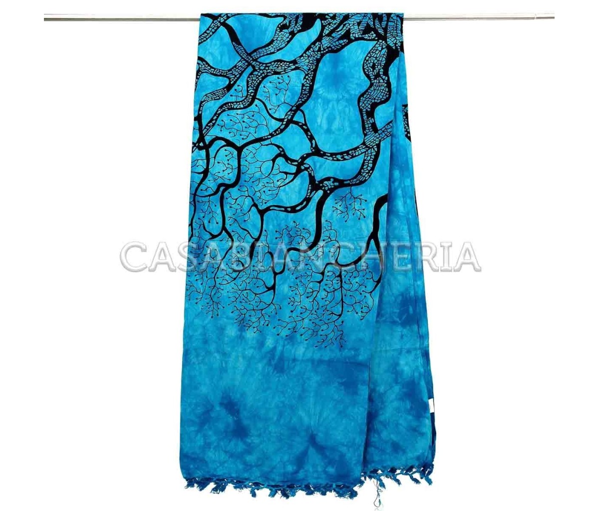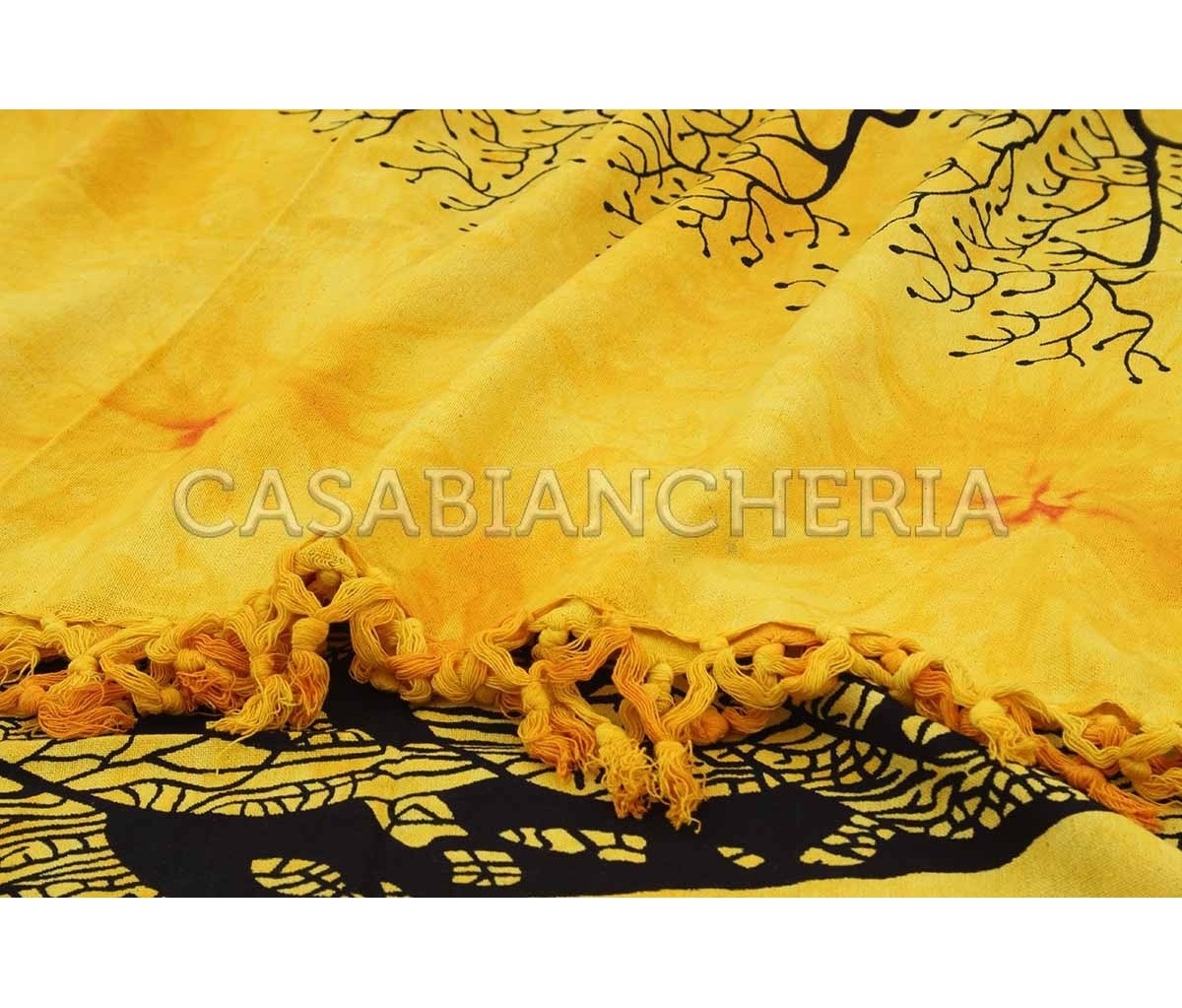Il copritutto copridivano Batik Albero è un prodotto originale indiano confezionato con tessuto di puro cotone stampato con fantasia piazzata a riquadro in diverse tonalità di colore e rifinito su due lati con frange annodate a mano.
