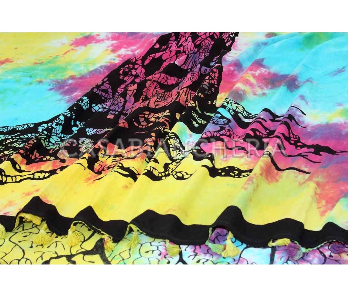 Il copritutto copridivano Batik Multicolor Albero è un prodotto originale indiano confezionato con tessuto di puro cotone stampato con fantasia piazzata a riquadro con fantasia multicolore e rifinito su due lati con nappe.
