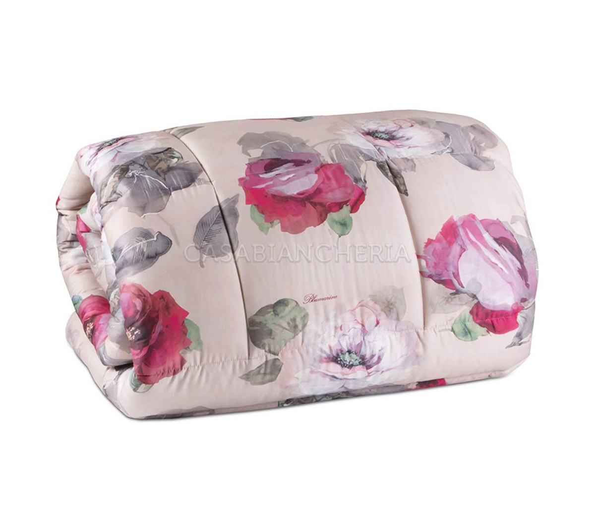 La trapunta Cloe di Blumarine Home Collection è confezionata con pregiato tessuto percalle di puro cotone, trapuntata a capo con angoli arrontondati e imbottita in fibra di poliestere anallergico da 340 gr/mq. Stampata con motivo floreale, il piumone invernale Blumarine Cloe è disponibile nella misura per letto matrimoniale in nuance rosa o azzurro.