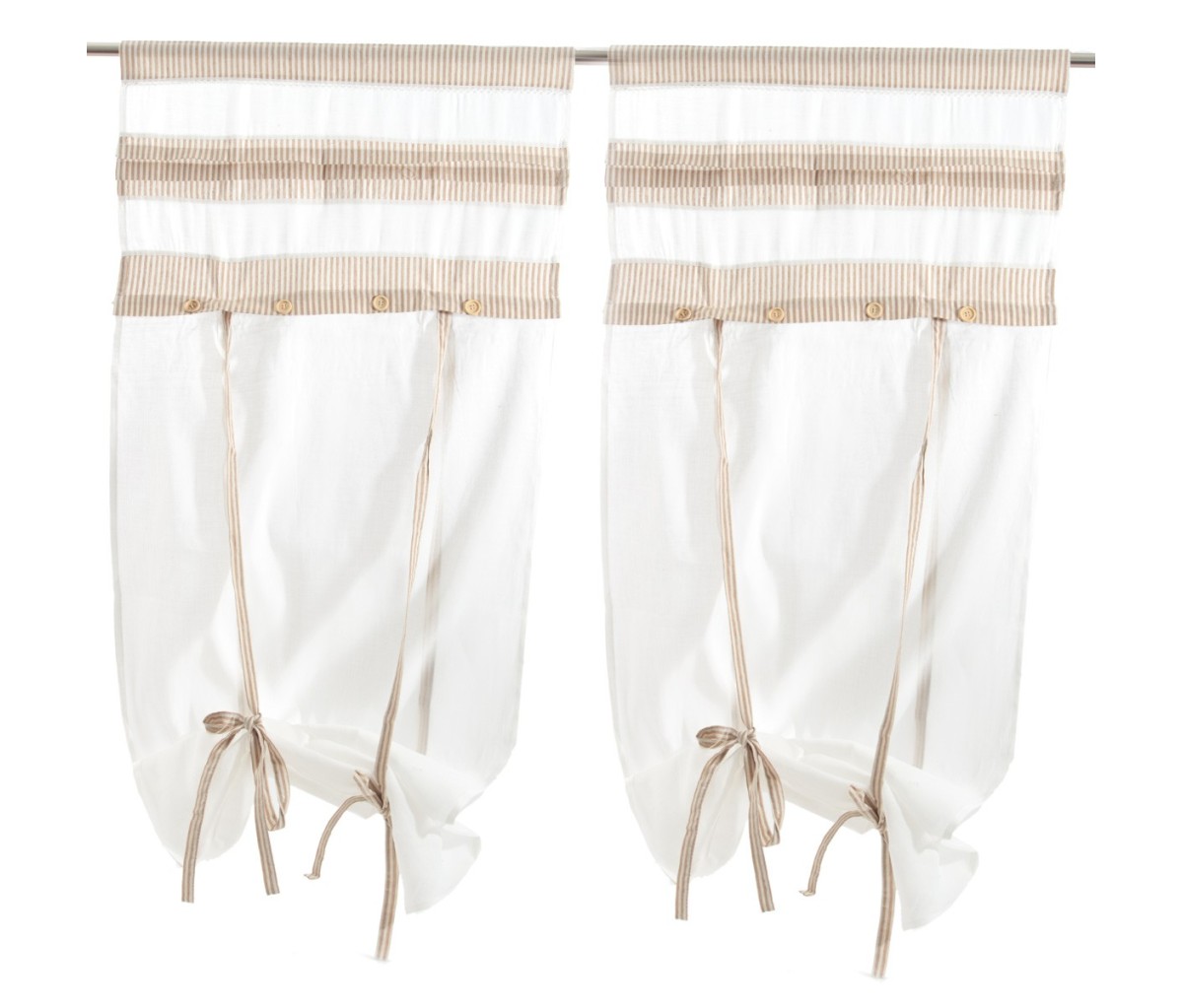 Le tendine infatti presentano nella parte superiore una mantovana decorata con righe sottili nella tonalità del beige, un profilo in crochet e bottoni applicati.