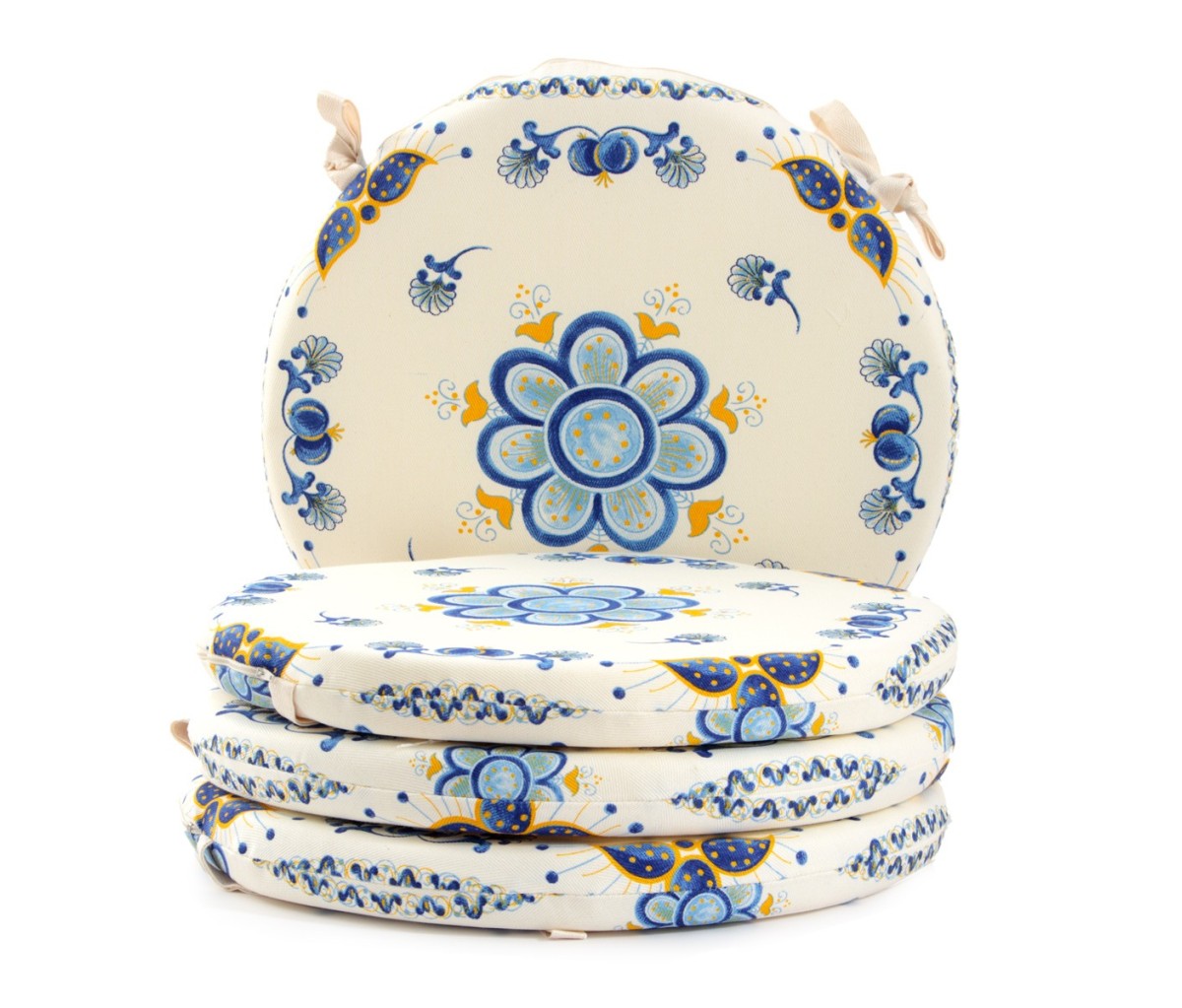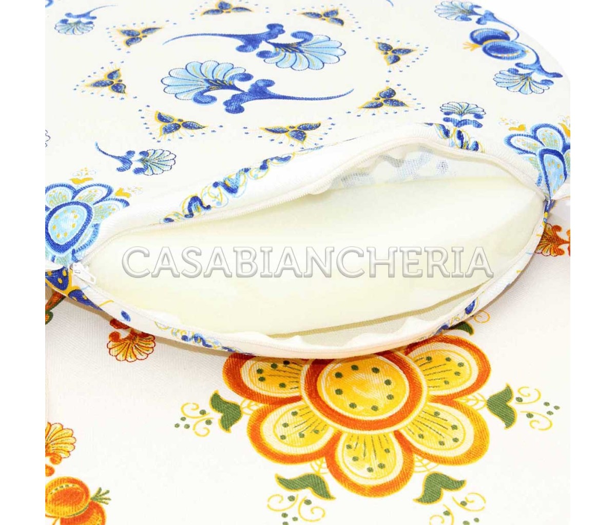 Il cuscino da sedia tondo con decoro Melograno della linea Stampe Artistiche Romagnole.