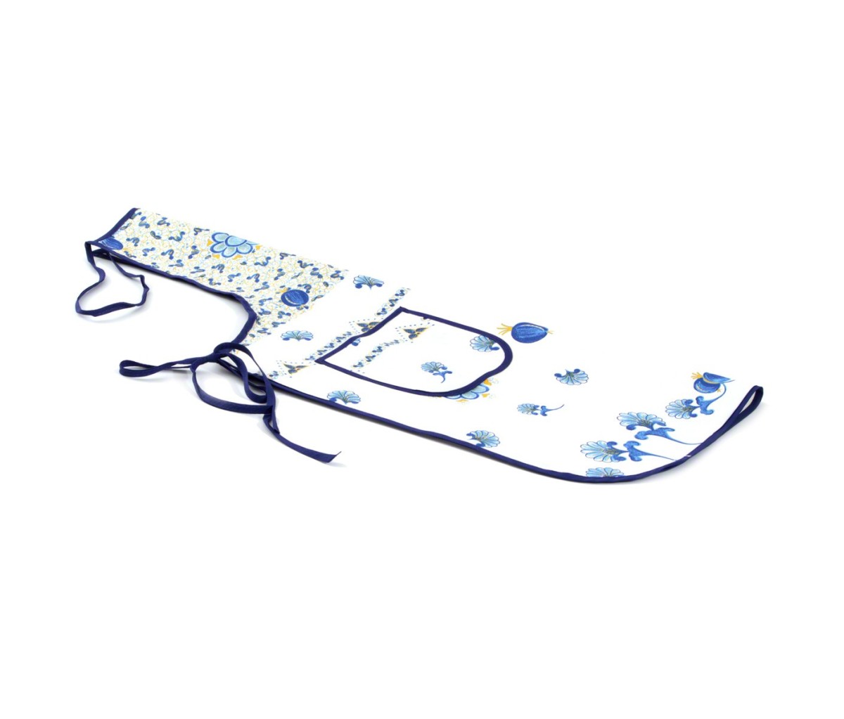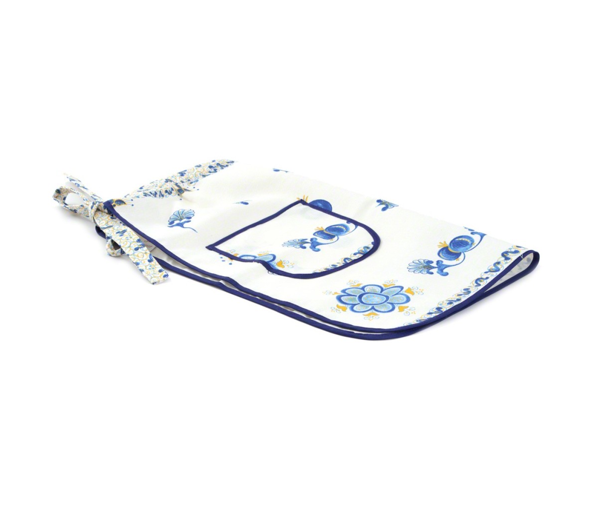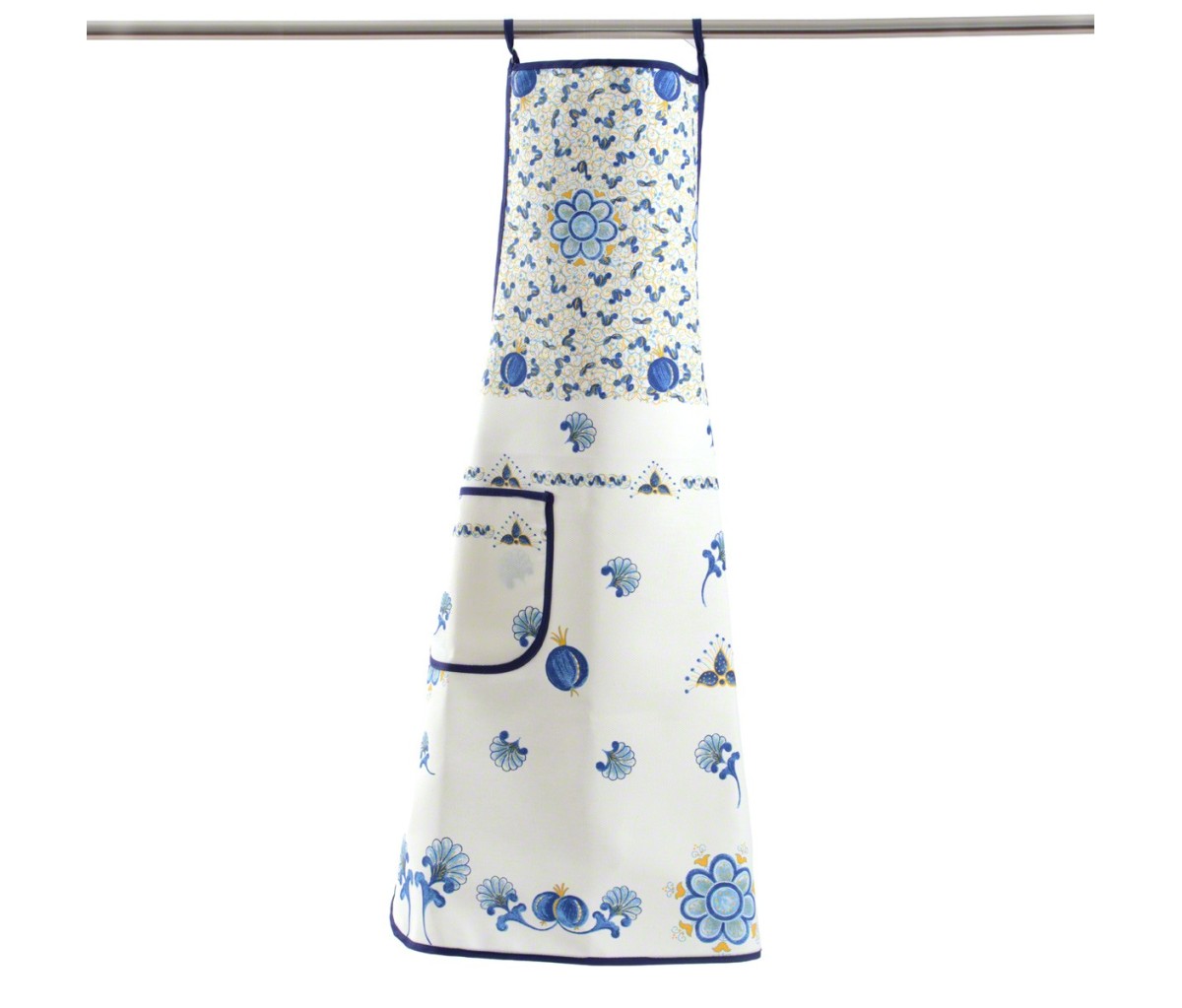 Il grembiule cucina Melograno Blu è realizzato con tessuto di puro cotone spinato morbido e resistente che dona al prodotto praticità d'uso e durata nel tempo ed è decorato con il caratteristico disegno “melograno” delle stampe romagnole e delle ceramiche di Faenza.