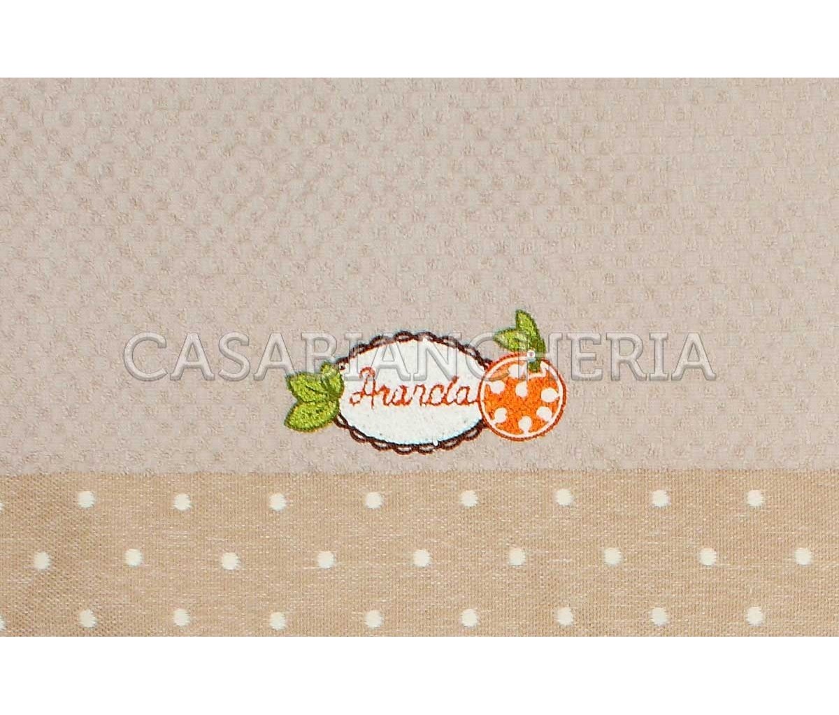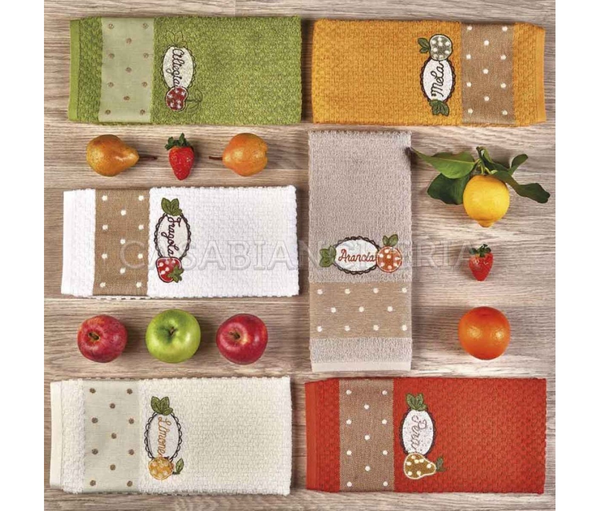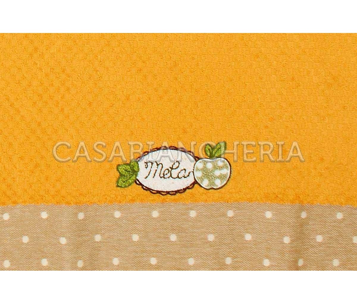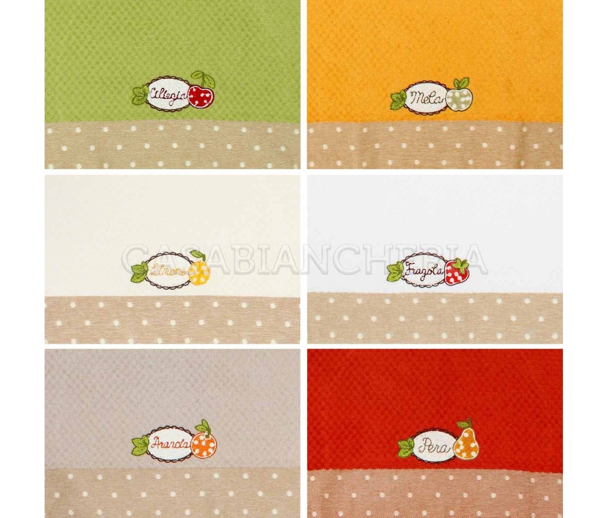 L'asciugamano da cucina Melange, confezionato in set da 6 pezzi, è prodotto con spugna jacquard a chicco di riso ed ha un ricamo su ogni singolo asciugamano.