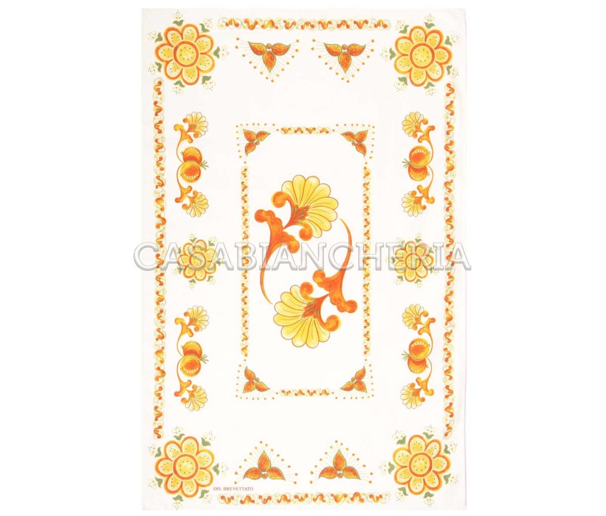 Ogni strofinaccio romagnolo Melograno Arancio è stampato a capo con decoro piazzato in 9 varianti di disegno. I disegni vengono forniti in base alle disponibilità.
