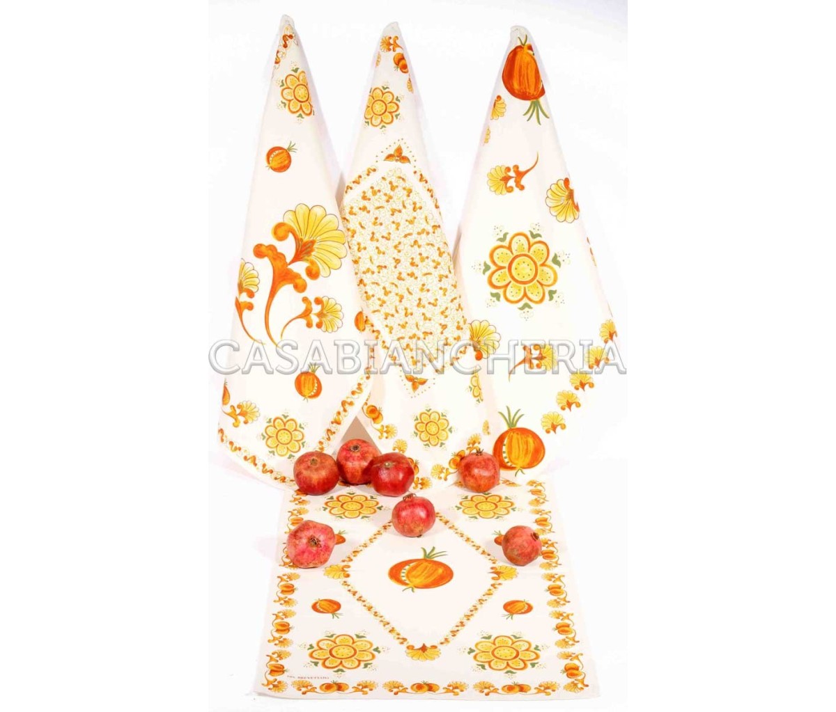 Arreda la cucina con i raffinati strofinacci romagnoli con le stampe delle ceramiche di Faenza Melograno Arancio.