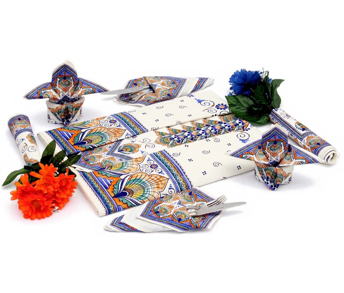 La tovaglia è disponibile in due misure per 6 e per 12 posti, con e senza tovaglioli.