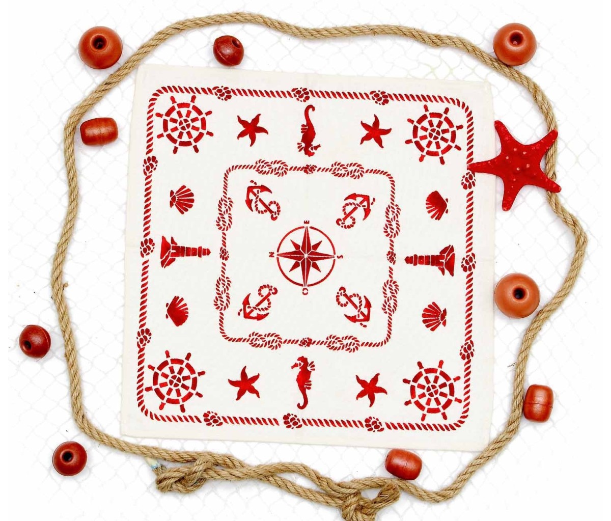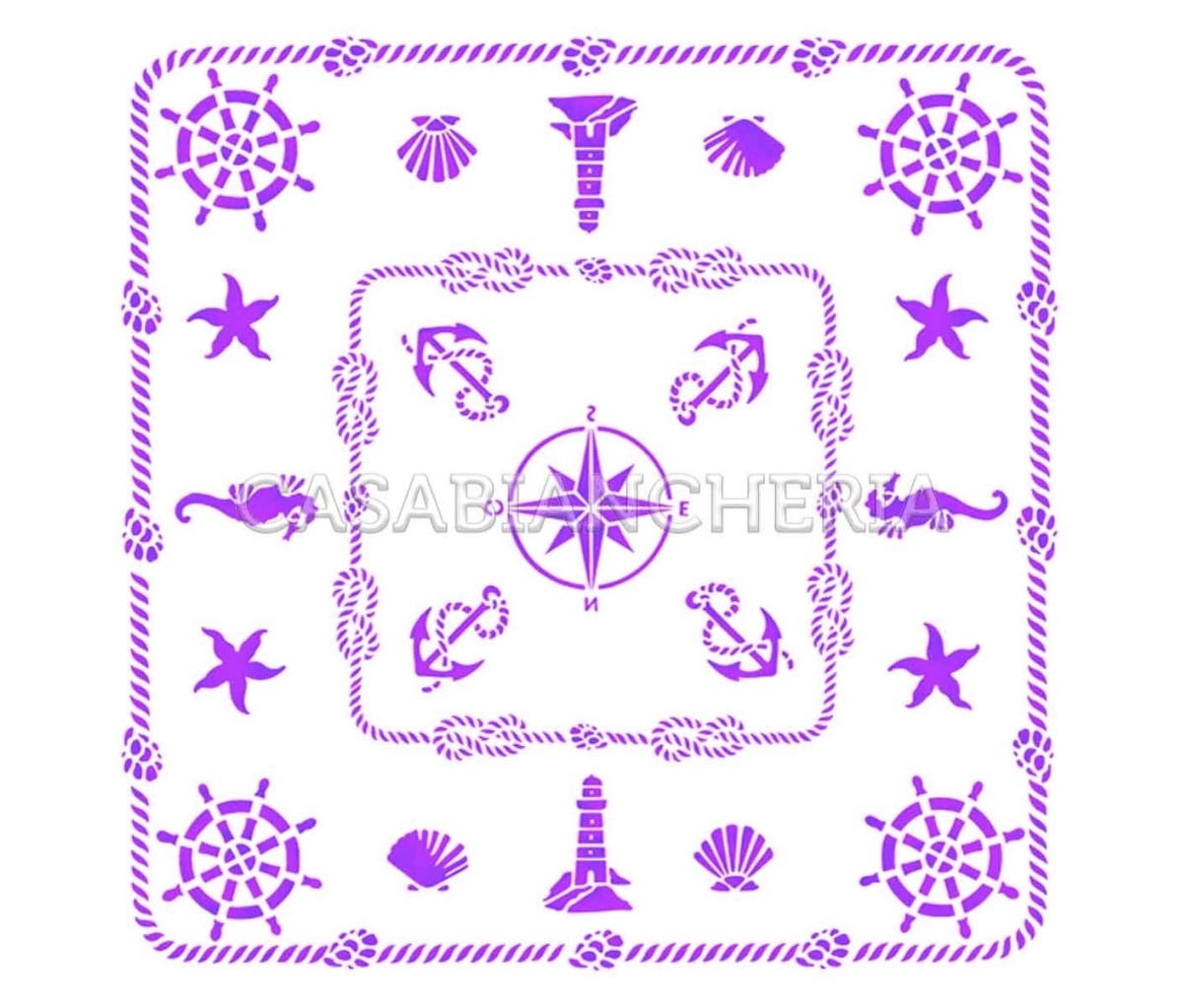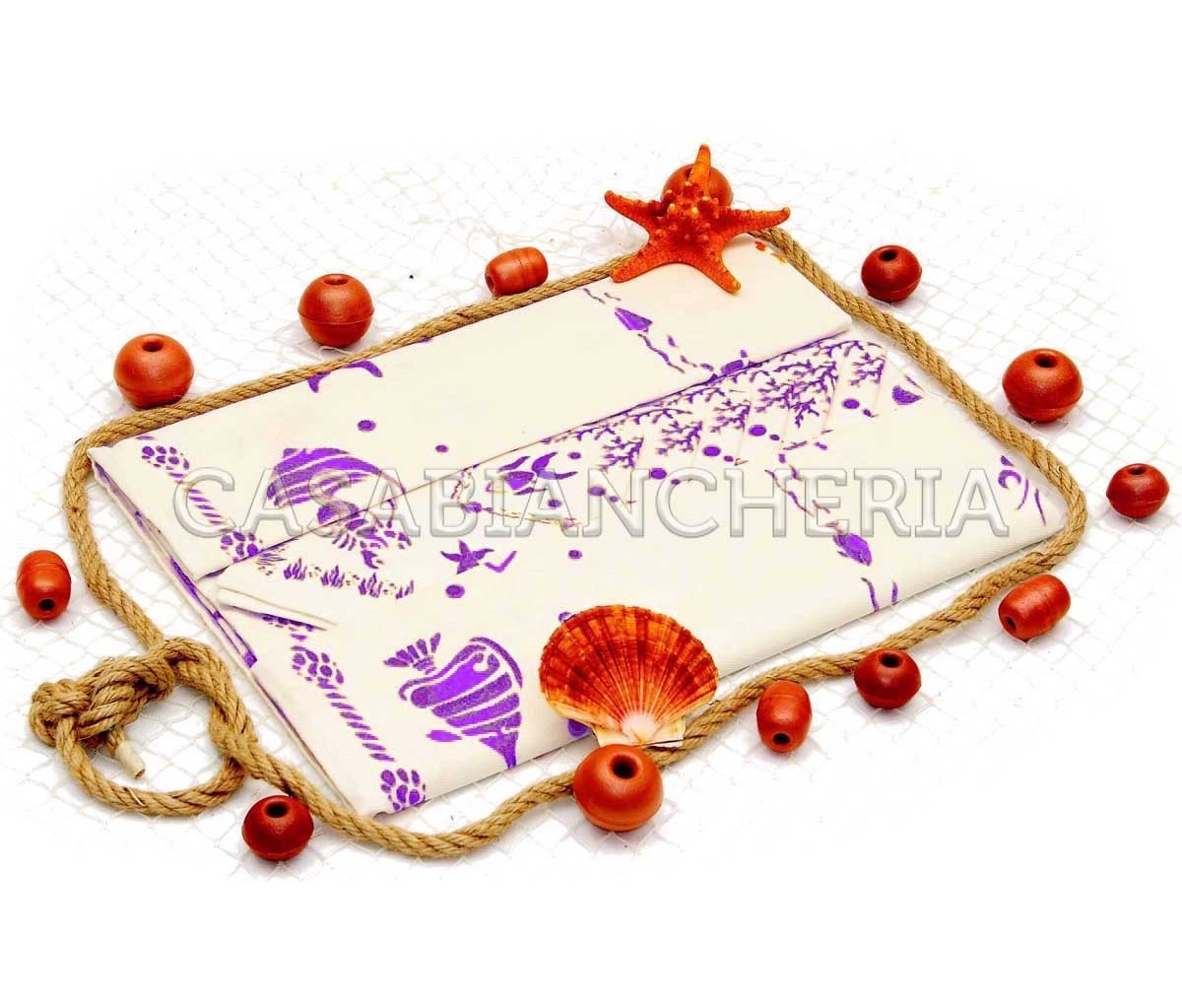 Il servizio da tavola Conchiglie è realizzato con tessuto di puro cotone spinato morbido e resistente che dona all'articolo praticità d'uso e durata nel tempo ed è decorato con motivo marino.