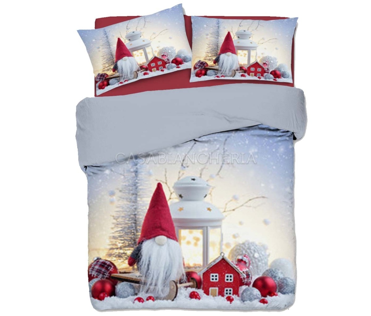 La parure copripiumino matrimoniale Gnomi è caratterizzata da una stampa digitale ad alta risoluzione sulle federe e sul sacco copripiumino con motivo natalizio. La parure copripiumino Regalo di Natale, composta dal sacco copripiumone e da due federe, è prodotta, stampata e confezionata in Italia con tecnica digitale che rende il tessuto morbido ed il decoro vivido e simile ad una fotografia.