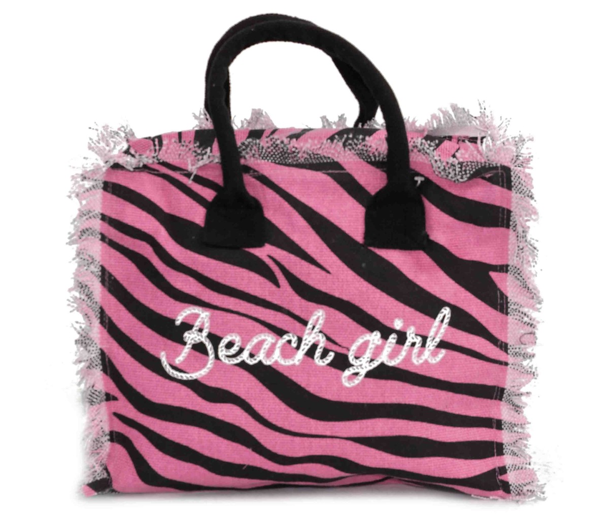 La hand bag da spiaggia Zebra, rifinita con frange, è dotata di chiusura con cerniera, taschino interno e di manici in tessuto.